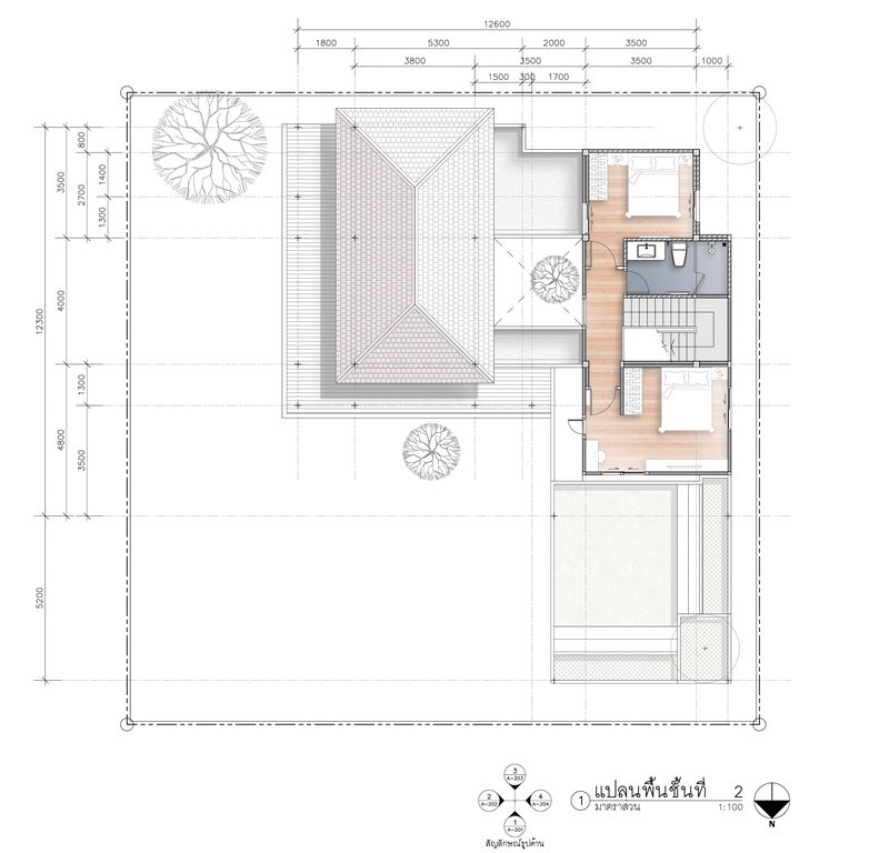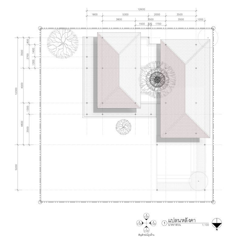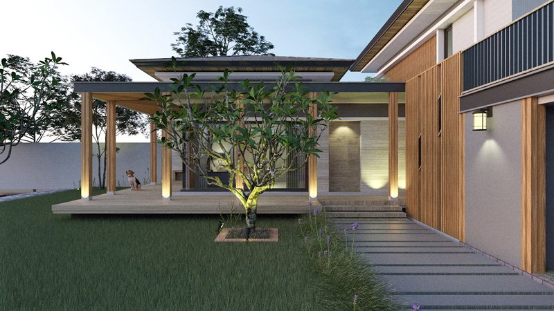 เนื่องจากพื้นที่อยู่ติดกับถนน 2 ด้าน จึงวางแปลนบ้านเป็นแบบตัวแอล (L) เพื่อเปิดรับมุมมองได้จากด้านหน้าทั้งหมด เมื่อมองเข้ามาจากถนนก็จะรู้สึกเหมือนบ้านหลังนี้มีหน้าบ้านทั้ง 2 ฝั่ง โดยตัวบ้านหลักหันหน้าไปทางทิศเหนือ ส่วนชั้น 2 ที่อยู่ฝั่งทิศตะวันตกก็ช่วยสร้างร่มเงาให้พื้นที่หน้าบ้านได้เป็นอย่างดี นอกจากนี้ยังโดดเด่นด้วยการใช้วัสดุไม้เข้ามาเสริม และเน้นในจุดที่สำคัญ เช่น เสา ผนัง ฝ้าเพดานภายนอก เปลี่ยนบรรยากาศให้ดูอบอุ่นและน่าอยู่มากขึ้น