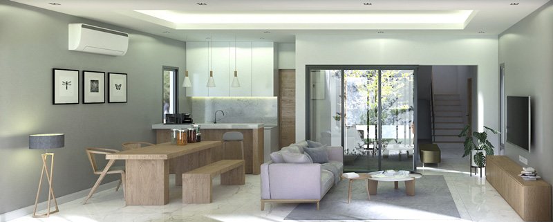 ภายในบ้านประกอบด้วย 3 ห้องนอน 2 ห้องน้ำ ตามมาด้วยพื้นที่ส่วนกลางในบริเวณเดียวกัน ประกอบด้วย ห้องโถงนั่งเล่น ห้องกินข้าว แพนทรี (Pantry) นอกจากนี้ยังมีคอร์ทส่วนตัวกลางสำหรับเปิดรับแสงตอนกลางวัน พร้อมช่วยทำให้ระบบอากาศภายในบ้านถ่ายเทได้ดี นอกจากนี้ยังมีระเบียงซักล้างที่สามารถเดิมเชื่อมมาจากพื้นที่จอดรถ โดยไม่ต้องผ่านประตูบ้านด้านหน้า สำหรับห้องนอนของพ่อกับแม่อยู่ชั้นล่าง ส่วนชั้นบนเป็นห้องนอนสำหรับลูก ๆ มีระเบียงไว้ชมวิวและทำกิจกรรมร่วมกัน ว่าแล้วก็ตามไปชมภาพสวย ๆ ของบ้านชั้นครึ่งหลังนี้กันเลย