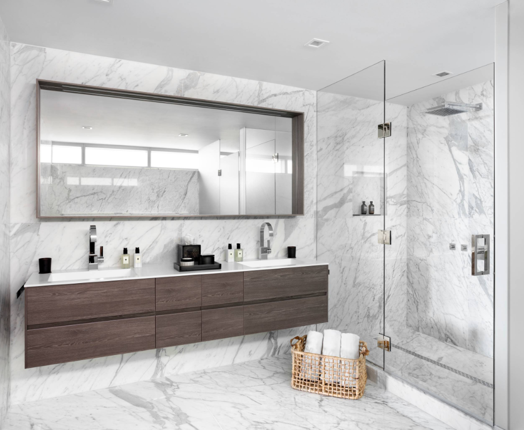 คุณสามารถเป่าผม ลงครีมบำรุงได้เสร็จสรรพในห้องน้ำ เมื่อคุณมีห้องน้ำขนาดใหญ่ พิจารณาติดตั้งพื้นที่สำหรับโต๊ะเครื่องแป้งในห้องน้ำ เหมือนอย่างห้องน้ำสุดหรูนี้ ช่วยให้คุณมีพื้นที่แต่งหน้า ทำผม ได้อย่างสะดวกมากๆ