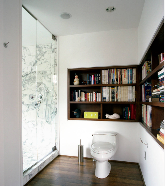 สำหรับมิตรรักนักอ่าน การมีชั้นวางหนังสือในห้องน้ำของคุณก็เป็นไอเดียที่ไม่เลวเลย อย่าลืมแบ่งส่วนเปียกและแห้ง เพื่อกันความชื้นที่อาจสร้างความเสียหายให้กับหนังสือด้วยล่ะ