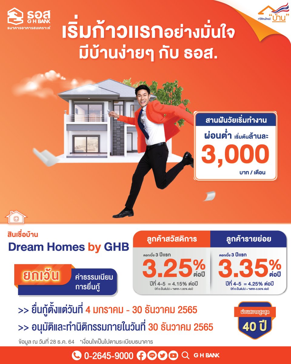 - สินเชื่อบ้านสำหรับสานฝันวัยเริ่มทำงาน ที่อยากมีบ้านเป็นของตัวเองกับ “สินเชื่อบ้าน Dream Homes by GHB” ให้คุณสามารถยืดระยะเวลาผ่อนได้สูงสุดถึง 40 ปี
