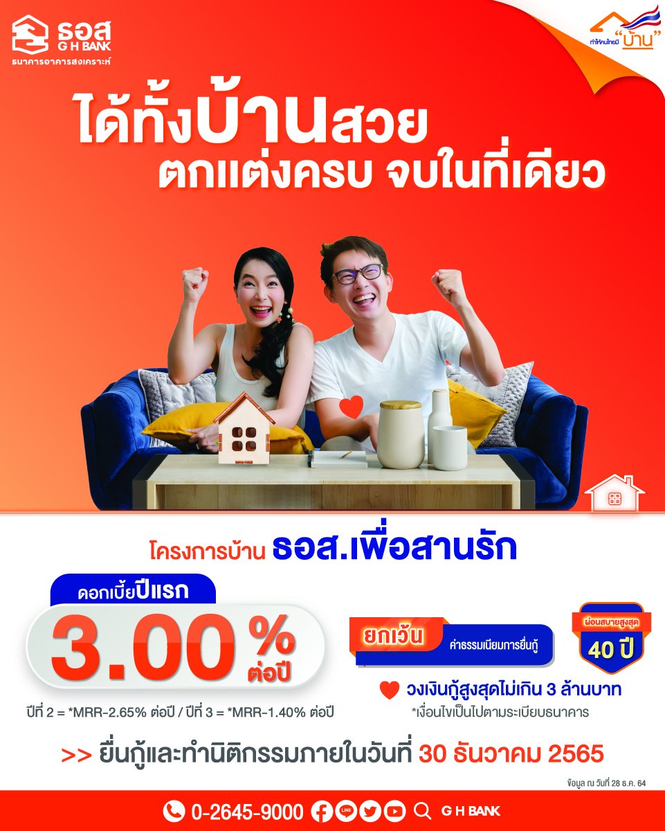 - สานต่อความรักของคุณให้กับบ้านหลังโปรด ด้วย “โครงการบ้าน ธอส. สานรัก ปี 2565” สำหรับผู้ที่มีรายได้ไม่เกิน 35,000 บาทต่อเดือน