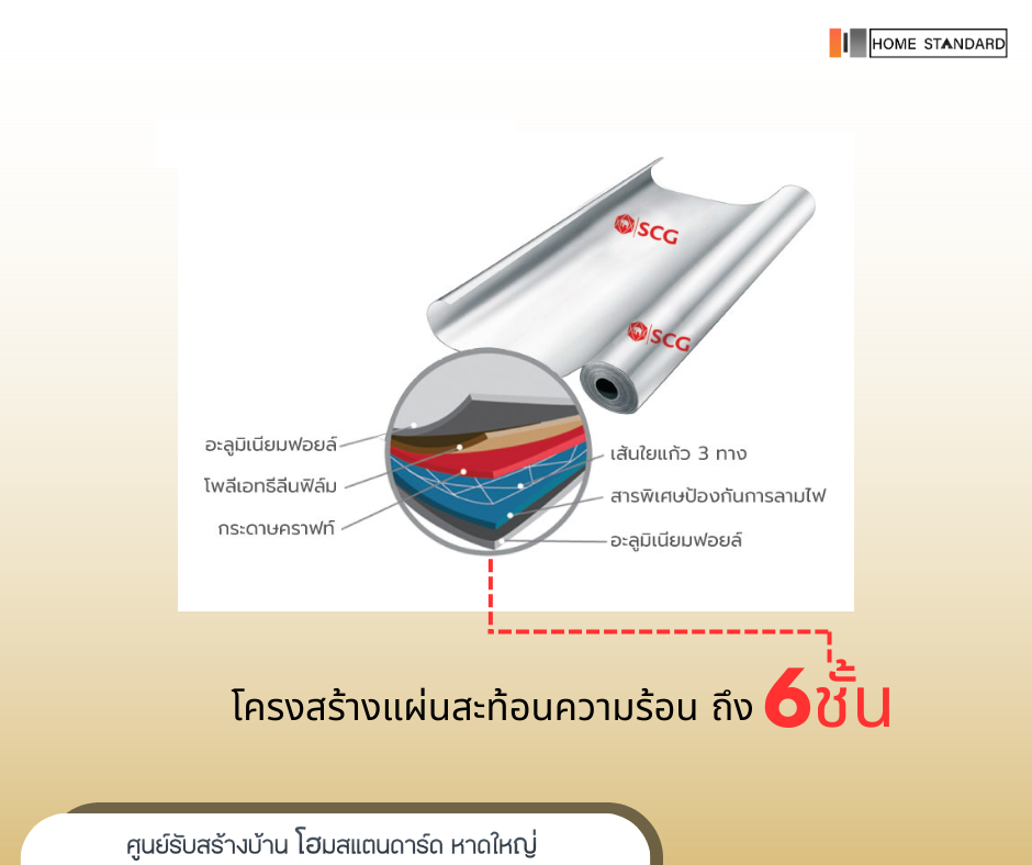 ชั้นที่ 6 อลูมิเนียมฟอยล์ด้านล่างทำหน้าที่สกัดกั้นการแผ่รังสีความร้อนไม่ให้ความร้อนถ่ายเข้าสู่ภายในบ้าน