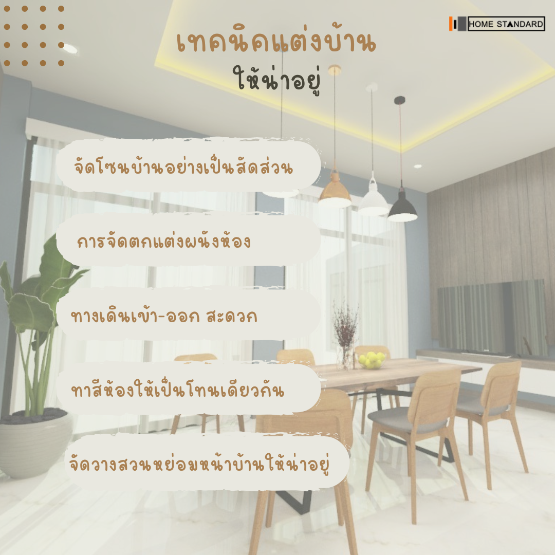 จะแต่งบ้านทั้งทีควรเริ่มจากตรงไหนดี เป็นเรื่องหลาย ๆ คนตั้งคำถามขึ้นมาบ่อย ๆ เมื่อมีความคิดที่จะลองตกแต่งปรับเปลี่ยนบ้านให้สวยงามเพื่อเพิ่มความน่าอยู่อาศัย และสร้างความผ่อนคลายเมื่อได้พักผ่อน วันนี้ Home Standard มีเทคนิคการแต่งบ้านให้น่าอยู่มาแนะนำเบื้องต้นดังนี้