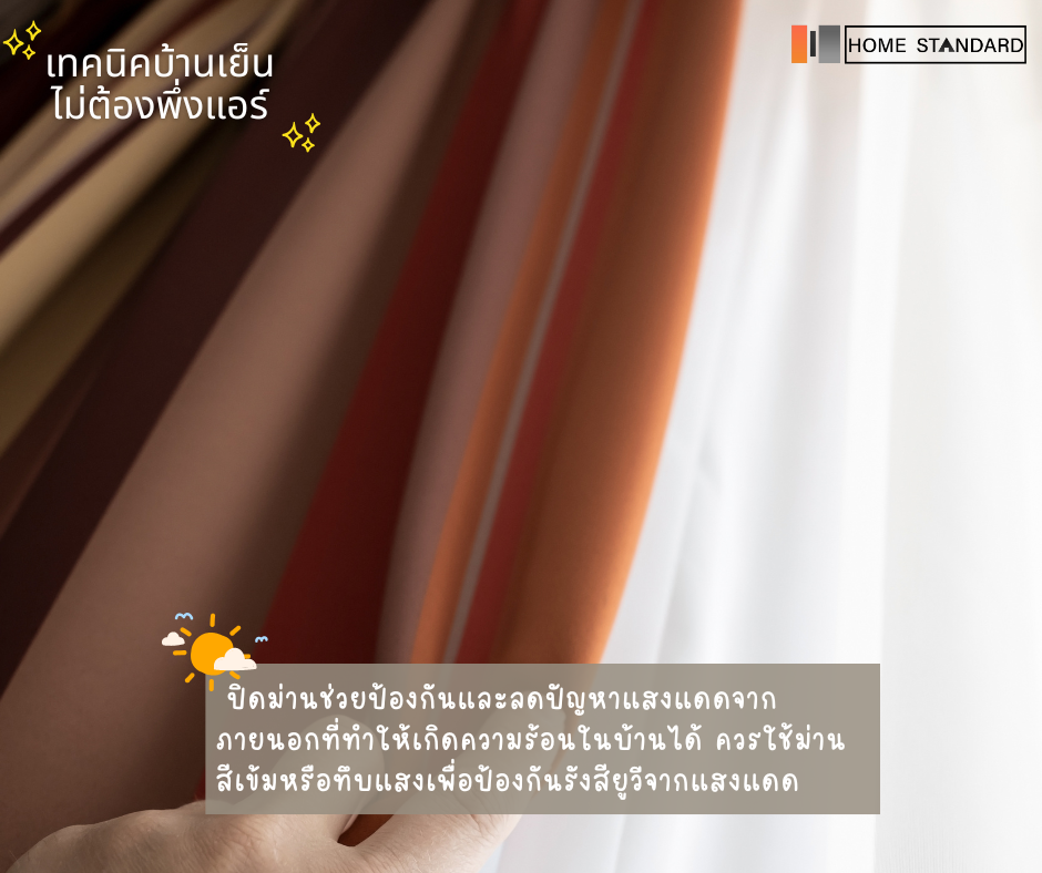 ม่านกันแดดจะช่วยป้องกันและลดปัญหาแสงแดดที่ส่องมาจากภายนอกที่ทำให้เกิดความร้อนในบ้าน หากคุณต้องการเลือกผ้าม่าน ควรใช้ผ้าม่านที่มีสีเข้ทหรือทึบแสงเพื่อป้องกันรังสียูวีจากแสงแดด เมื่อแสงกับความร้อนผ่านเข้ามาได้ยากขึ้น ห้องก็จะไม่ร้อนอบอ้าว