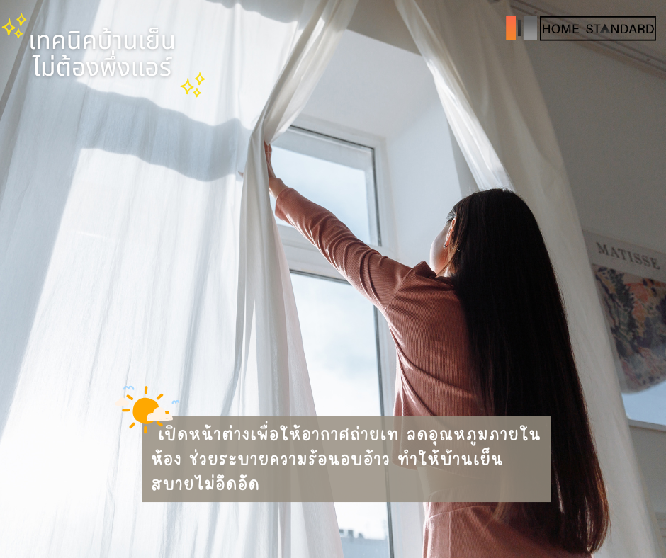 เปิดประตูหน้าต่างเพื่อช่วยให้อากาศถ่ายเท และลดแุณหภูมิภายในห้อง ระบายความร้อนอบอ้าว ช่วยทำให้บ้านเย็นสบายไม่อึดอัด แนะนำให้เปิดประตูหน้าต่างรับลมในช่วงเย็นถึงช่วงค่ำ จะช่วยระบายอากาศร้อนๆ ออกไปทำให้บ้านเย็นขึ้นได้