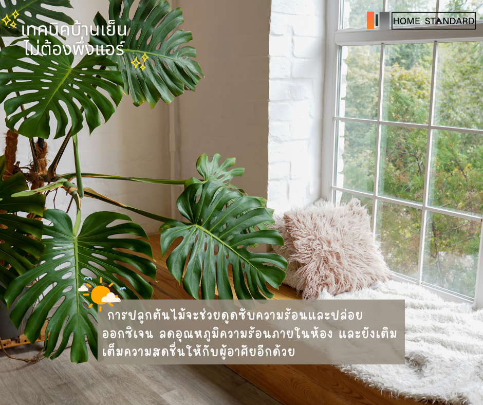 การปลูกต้นไม้จะช่วยดูดซับความร้อนและปล่อยออกซิเจน ลดอุณหภูมิความร้อนภายในห้อง และยังเติมเต็มความสดชื่นให้กับผู้อาศัยอีกด้วย การมีต้นไม้รอบบ้านช่วยให้บ้านเย็นขึ้นได้ และการปลูกต้นไม้ไว้รอบบ้านยังสามารถใช้เงาของร่มไม้บังแดดบังลมให้กับบ้านได้อีกด้วย