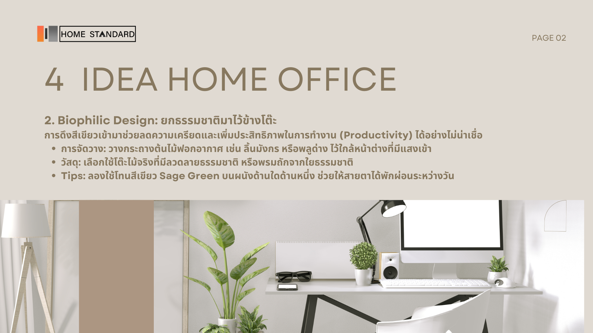 การเคลื่อนไหว: หากพื้นที่อำนวย ลองหาโต๊ะแบบปรับระดับได้ (Standing Desk) เพื่อสลับจากการนั่งเป็นการยืนทำงานบ้าง